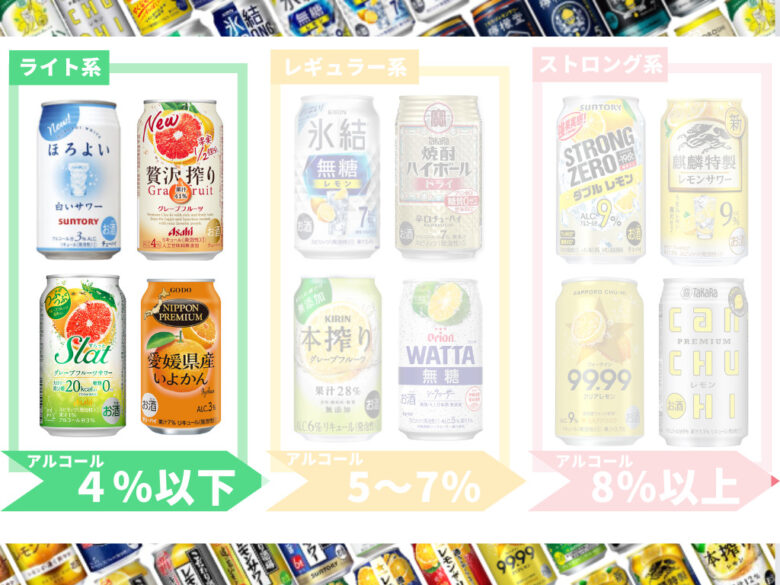 まずは、アルコール度数が4%以下の「ライト系」チューハイです。