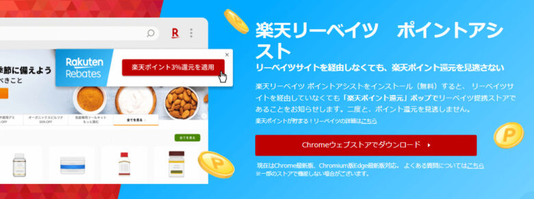 楽天リーベイツ(Rebates)の経由を忘れないよう、ブラウザ派の人は「楽天リーベイツ ポイントアシスト」を利用を検討してみてはいかがでしょうか。